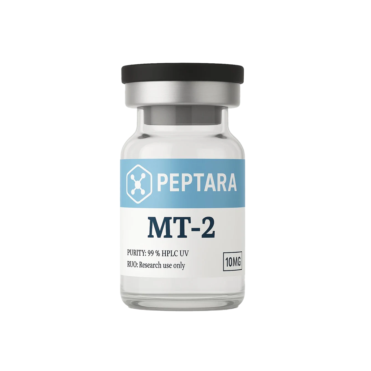Melanotan II (MT-2) is a synthetic peptide analog of alpha-melanocyte-stimulating hormone (α-MSH). It has been examined in laboratory and preclinical research for its interactions with melanocortin receptors, with studies focusing on pigmentation pathways, photoprotection models, and related physiological processes. Each batch is ≥99% pure and verified through HPLC UV testing.